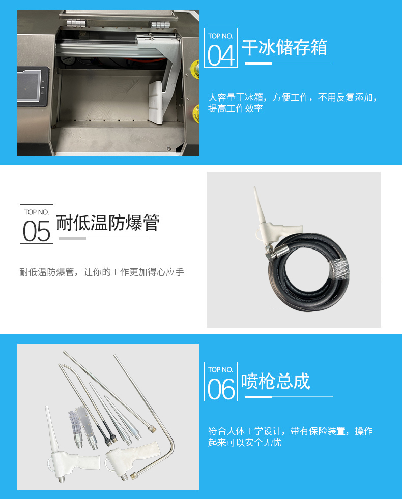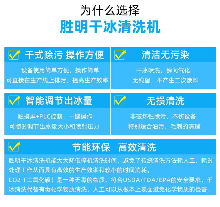 干冰粒在接觸時(shí)會(huì)升華(蒸發(fā)),清洗過(guò)程中沒(méi)有產(chǎn)生化學(xué)物質(zhì)、無(wú)毒、非磨料、非易燃、非導(dǎo)電;消除化學(xué)清潔的成本和危害,避免昂貴的環(huán)境清潔要求。
