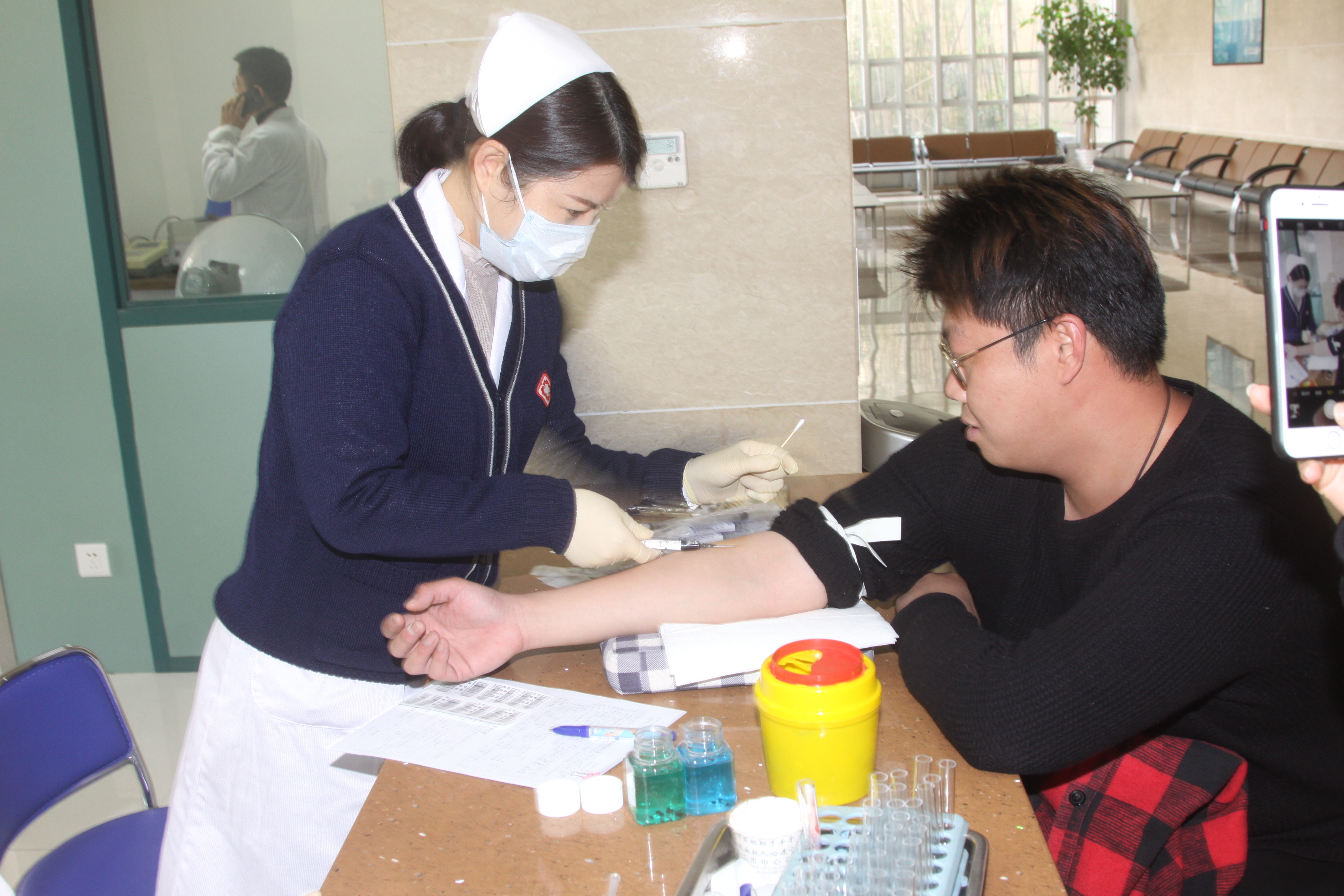在血液中心工作人員的指導(dǎo)下,捷誠職工排著長隊(duì)測量血壓、抽血化驗(yàn),有條不紊的進(jìn)行著血液檢驗(yàn)。