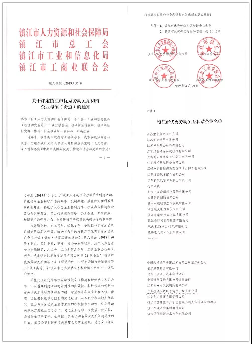 近日,鎮(zhèn)江市人力資源和社會(huì)保障局、鎮(zhèn)江市總工會(huì)、鎮(zhèn)江市工業(yè)和信息化局、鎮(zhèn)江市工商業(yè)聯(lián)合會(huì)等部門聯(lián)合舉辦了鎮(zhèn)江市優(yōu)秀勞動(dòng)關(guān)系和諧企業(yè)評(píng)選活動(dòng),經(jīng)前期申報(bào),上級(jí)有關(guān)部門審核,江蘇捷誠榮獲“鎮(zhèn)江市優(yōu)秀勞動(dòng)關(guān)系和諧企業(yè)”稱號(hào)。