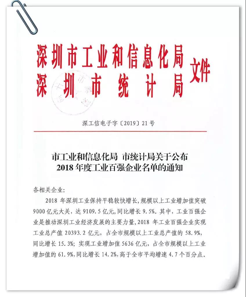 深圳市工業和信息化局、深圳市統計局經過嚴格的分析統計評選,于近日聯合公布了2018年度深圳市工業百強企業,深圳海派得以榮登榜單。
