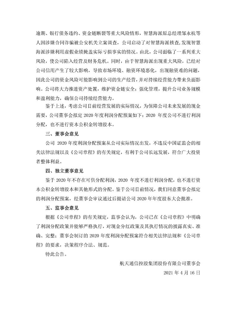 航天通信控股集團股份有限公司關于2020年度擬不進行利潤分配的公告