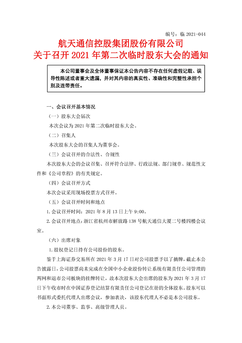 航天通信控股集團(tuán)股份有限公司關(guān)于召開2021年第二次臨時(shí)股東大會(huì)的通知